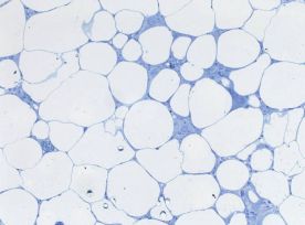 Immunzellen (blau gefärbt) zwischen die Fettzellen (weiß) einwandern.