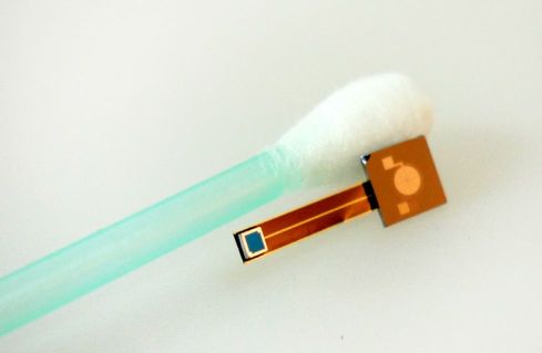 einem Wattestäbchen. Rechts ist der Schallwandler, der direkt am